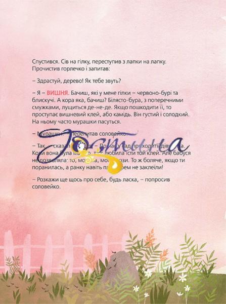 Соловейко повернувся з далекої Африки і шукає, де звити собі гніздо. А в саду стільки дерев і кущів! Яке з них може стати домівкою для пташки? Можливо, це вишня, черешня або алича? Слива чи груша? Кожне дерево розповідає соловейкові свою історію, наголошуючи на тому, чим воно особливе. У розповідях дерев постає також образ дідуся-садівника – розумного і доброго, який ставився до дерев як до одухотворених істот, розмовляв із ними і плекав – і його родини, яка досі живе у домі поруч, шанує дерева і збирає їхні плоди.