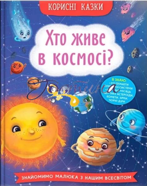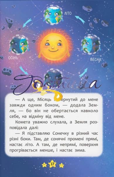 Ця книжка не звичайна, вона повчальна. Ми розповімо тобі чарівні космічні історії про наш Всесвіт та маленьку мандрівницю Комету, якій дуже кортіло знайти собі друзів та зрозуміти, що ж таке той космос. Під час захопливої подорожі Всесвітом Комета познайомилася із Сонцем та планетами Сонячної системи, затоваришувала із Землею та її вірним супутником Місяцем, зустріла безліч нових знайомих — астероїди, метеороїди, зірки та навіть чорну діру. Розгортай книжку, читай про пригоди маленької Комети й пізнавай наш Всесвіт разом з нею!