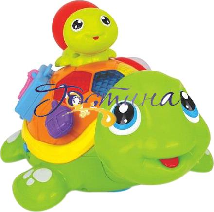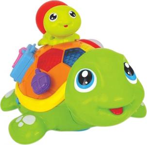 Черепашка-батько рухатиметься, якщо посадити малюка їй на спину. Іграшка розвиває рухові, слухові навички та міжособистісного спілкування.