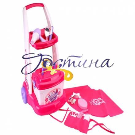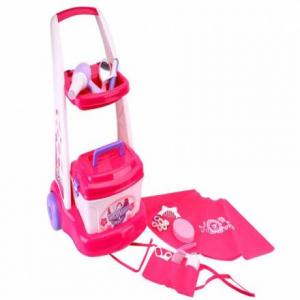 Такий набір принесе море радості маленьким модницям та зробить ігри дуже реалістичними. Розміри іграшкового приладдя оптимально розраховані для дитячих ручок. Також їх зручно взяти з собою на прогулянку чи у садок. Зберігати та переносити перукарські інструменти та аксесуари можна у місткому саквояжі на защіпках та на візочку. На нижній полиці візка є спеціальне місце для саквояжа, а на верхній полиці з трьома гачками розмістити дрібні елементи набору. Візок зручний та маневровий, добре їздить на різних поверхнях, стійкий до перекидань.