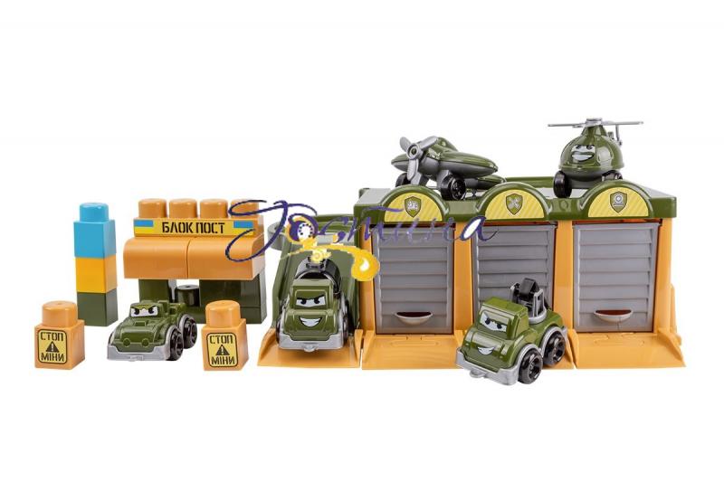 У паркінгу 3 сервісні бокси для авто: автомийка, ремонт та шиномонтаж. На даху – великий майданчик для вертольота та літака. Для захисту від ворога – міцний блок-пост із елементів конструктора. Вертоліт і літак в комплекті. 3 міні машини: автокран, позашляховик, цистерновоз. На бічній стінці – 2 колонки з бензином А95 та дизпаливом.Особенностью боксов является рычаг "катапульта", выталкивающий машинки из гаража в мир интересных приключений. Рычаг расположен на задней стенке бокса. Запускать автомобили с помощью рычага – особенно интересная игра для детей и взрослых. Можно проводить соревнования по быстрому выезду. Для плавного движения из гаража и спуска предусмотрен съезд.