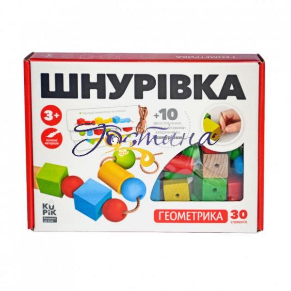 У комплект входить 30 дерев'яних кольорових елементів - 10 кубиків, 10 кульок, 10 циліндрів, 2 шнурка довжиною 40 см, 10 кольорових двосторонніх карток з цікавими завданнями різної складності 40 завдань.