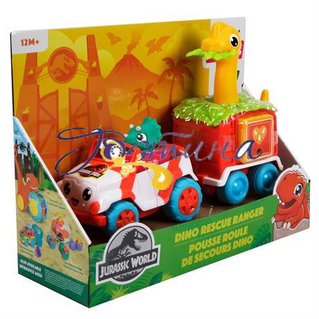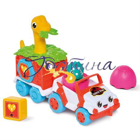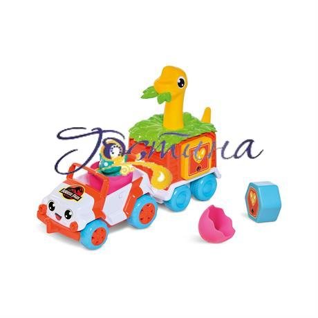Іграшковий дінотрейлер Toomies створений для заохочення розвивальних ігор малюків. Спереду в машині сидить маленький трицератопс. Струсіть його, щоб почути миле гарчання. Приєднайте до машинки причіп, усередині якого їде брахіозавр.