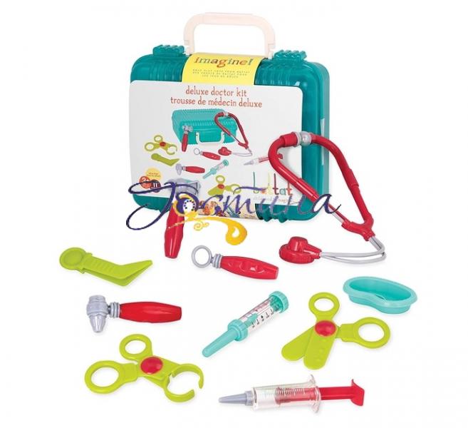 Зручний кейс містить усі аксесуари, необхідні для маленького лікаря: фонендоскоп, отоскоп для огляду вушок, молоточок для перевірки рефлексів, медичне дзеркало, термометр, ножиці, пінцети, шприц, підставка для інструментів. Пацієнту потрібна швидка допомога? Всі інструменти розмістяться в переносній валізці.
