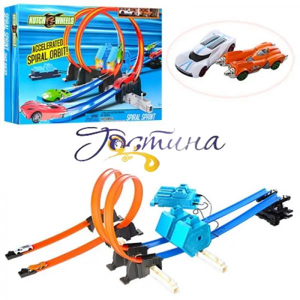 Трек із трюковими колами, машинка-метал 7 см 2 шт, на бат-ці, у коробці 60-38,5-8 см.