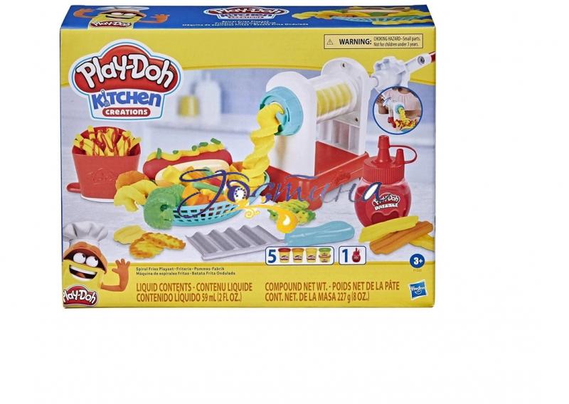 Іграшка для приготування картоплі фрі, що викручує спіральну або хвилясту картоплю Play-Doh. Додайте кетчуп або гострий соус за допомогою червоної пляшки Play-Doh Drizzle.