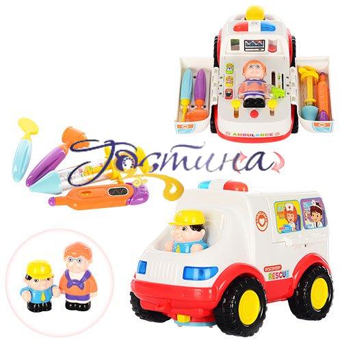 Набір медичних інструментів допоможе дитині стати справжнім лікарем. Машина починає їхати, якщо доторкнутися до водія: вмикається звук двигуна і звучить сирена, блимають фари. Іграшка самостійно їздить по кімнаті, об'їжджаючи всі перешкоди на шляху. Машинка може трансформуватися на операційний стіл. При натисканні на кнопки іграшка видає звуки стукоту серця, бурчання живота та кашель. Є апарат штучного дихання, рентгенівський апарат, кардіомонітор. Програє 3 мелодії. У комплект входять: машина "Швидка допомога", шприц, скальпель, термометр, зовнішнє зеркало, лялька-пацієнт, лялька-водій, шнурок для катання.
