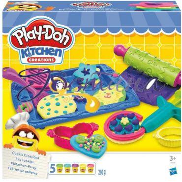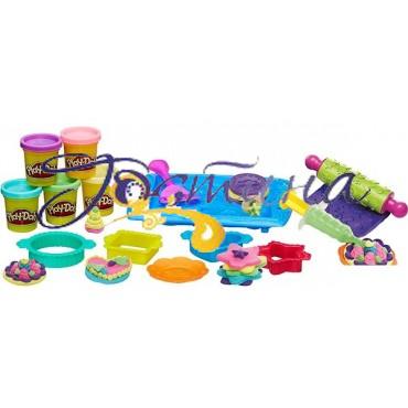 У комплекті: Скалка, форми для печива, еструдер, лопаточка, деко і 5 стандартних баночок пластиліну Play-Doh.