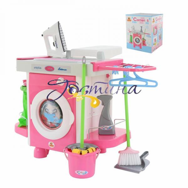 Ігровий набір Пральна машинка Carmen 5. За допомогою іграшкових приладів побутової техніки діти пізнають навколишній світ, засвоюють соціальні ролі, звикають до відповідальності. Ця яскрава функціональна іграшка сподобається будь-якій маленькій хазяєчці. Комплектація: прасувальний стіл, праска, сушарка для білизни, совок, відро. Упакування: коробка. Розмір упаковки: 48 х 39 х 38 див.