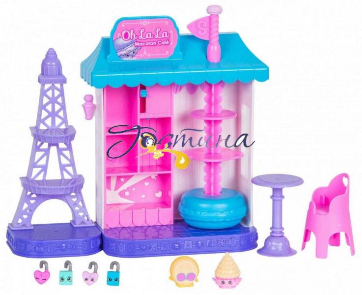 Шанувальники Bonjour Shopkins, ось ми в прекрасному Парижі - місті кохання! Сядьте в кафе Macaron біля Ейфелевої вежі і отримуйте задоволення! Зробіть шоколад Shopkins або закрутіть їх. Проведіть час зі своїми друзями French Shopkins! Аксесуари в комплекті: - Набір Macaron Cafe - Ейфелева вежа - 2 фігурки Шопкінса - 4 міні Shopkins - 1 стілець - 1 стіл