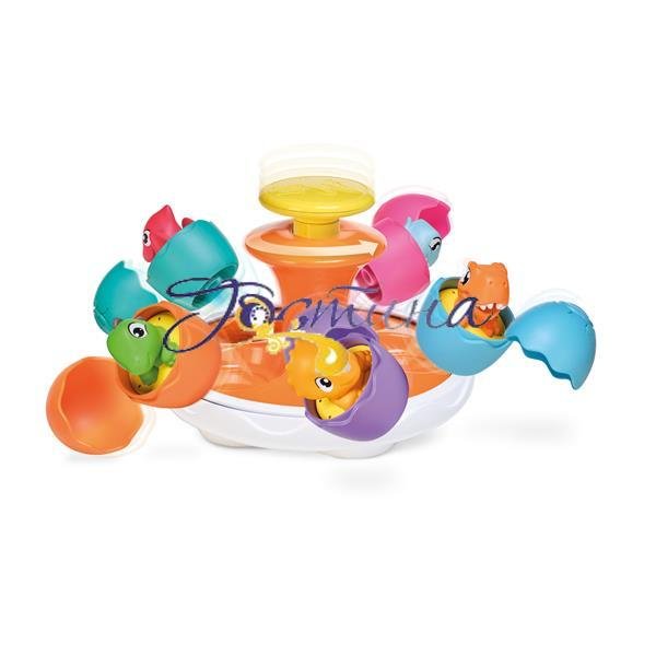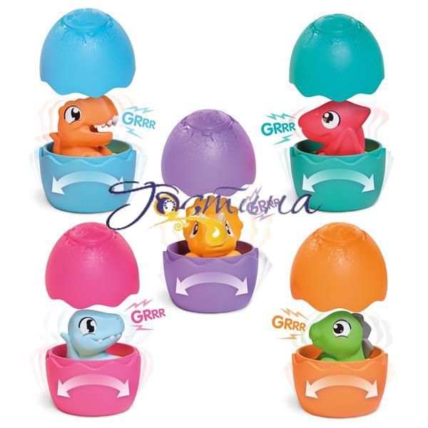 Прийшов час заповнити гніздо всіма п'ятьма різнокольоровими яйцями і допомогти їм вилупитися! Просто натисніть на важіль, щоб подивитися, як вони обертаються на дзизі. Натискайте все швидше, доки... а ось і вони! Підберіть динозаврам шкаралупу за кольором і повторіть гру. Або помістіть їх назад в інкубатор і накрийте прозорою кришкою до наступної гри.