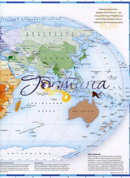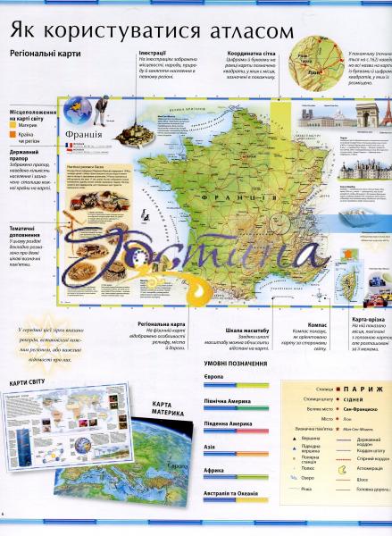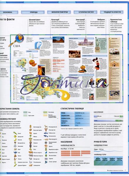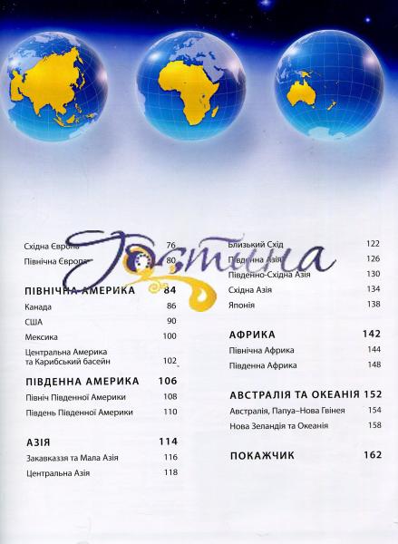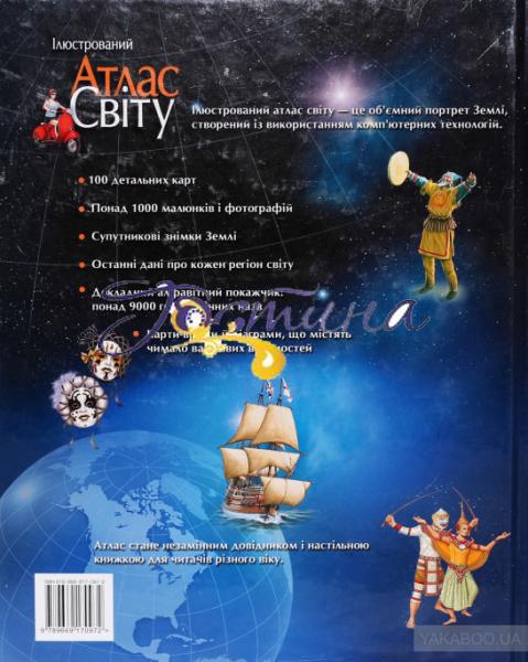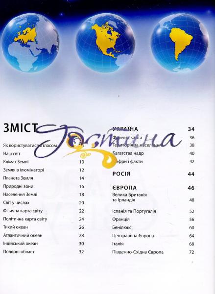 Атлас світу містить понад 100 карт, складених з урахуванням новітніх політичних і географічних даних, і 1000 ілюстрацій, зокрема цінних супутникових фотознімків, які дають змогу юним читачам побачити Землю у незвичному ракурсі. Видання розповідає про формування нашої планети, її місце у Всесвіті, геологічну будову та природні зони Землі, клімат і погоду, моря й океани. Атлас докладно характеризує кожний регіон світу, надаючи новітні відомості про природні ресурси та економіку, визначні пам'ятки та історичних осіб, природу, традиції, звичаї, основні віхи історії. Великий розділ присвячено Україні — її географічним особливостям, історії та культурі. Беззаперечним достоїнством видання є дуже докладний алфавітний покажчик, що містить понад 9000 географічних назв. Його доповнюють численні графічні елементи, що допоможуть читачам швидко й легко знайти будь-який географічний об'єкт. Атлас стане чудовим довідником для допитливих читачів, які хочуть поглибити свої знання про світ і зміни в ньому.