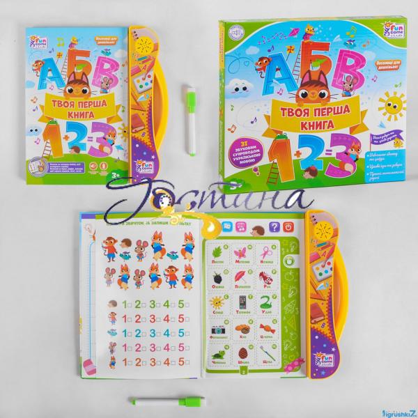 Для того, щоб активувати потрібну сторінку, необхідно натиснути на сенсорну кнопку із зображенням вказівного пальця. Кожна сторінка містить 15 іконок з різними зображеннями, при натисканні яких можна почути букву, цифру, фігуру, тварину та віршик про неї. Перші сторінки навчать дитину алфавіту та кільком словам, з третьою сторінкою малюк дізнається про геометричні фігури та кольори, з четвертою – про цифри, на п'ятій зображені різні овочі, на шостій – фрукти, сьома сторінка повна різних транспортних засобів, а на восьмій, дев'ятій та десятої зображені дикі, сільськогосподарські та підводні тварини. З такою навчальною та забавною книжкою малюк поступово вивчатиме навколишній світ і в нього не буде часу нудьгувати!