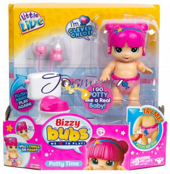 Ця маленька непосида занадто зайнята, щоб спати! Коли вона щаслива, вона співає й хихикає. Розумниця Chloe — просто Зірка, коли справа доходить до використання туалету! Погодуйте її, і вона скаже Вам, коли їй знадобиться горщик, а потім радісними рухами дасть знати, що зробила «сюрприз». Зніміть її, щоб дізнатися, який саме. Натисніть кнопку на підгузку один раз, і лялька виконуватиме дію — проситиметься на горщик. Вона може навіть танцювати та співати. Натисніть кнопку на підгузку тричі або більше — буде сміятися. Дайте їй пляшечку — Ви почуєте, як вона п'є і потім звук задоволення. Коли малятко втомиться, дайте їй пипку, і вона засне. Розбудити її можна, просто вийнявши пипку.