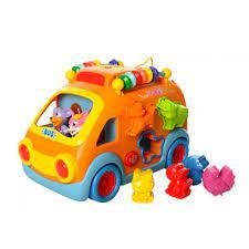 Сортер з шістьма фігурками тварин оснащений звуковими ефектами. Проштовхнувши кожну тварину в відповідний отвір, малюк почує її голос. Дістати фігурки можна, відкривши багажник за допомогою ключа на даху автобуса.