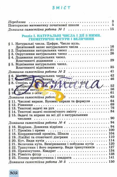 Матеріал підручника є продовженням курсу математики, вивчення якого розпочато в початковій школі. На початку підручника розміщено завдання для узагальнення і систематизації знань за курс початкової школи, а в кінці матеріал для узагальнення і систематизації знань за курс математики 5 класу та додаткові теми для резервного часу.