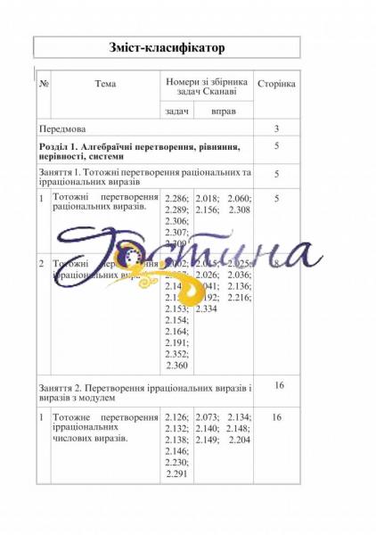 Перша книга посібника містить 40 занять, які охоплюють теми: «Алгебраїчні перетворення, рівняння, нерівності, системи», «Тригонометрія», «Логарифми. Логарифмічні і показникові рівняння, нерівності, системи».