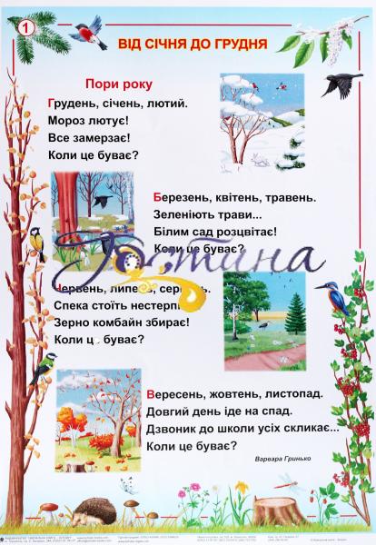 Таблиці “Я досліджую світ. Пори року” — елемент навчально-методичного комплекту, який рекомендується використовувати на уроках інтегрованого курсу “Я досліджую світ”, під час пояснення, закріплення, узагальнення знань, умінь і навичок учнів. Зміст посібника відповідає вимогам Державного стандарту початкової освіти та типовим освітнім програмам. Він містить ілюстрації до пір року, ребуси, загадки, прикмети, прислів’я, приказки, вірші, цікавий пізнавальний та розвивальний матеріал. Для вчителів початкових класів, вихователів груп продовженого дня, дитячих дошкільних закладів. Зміст Від січня до грудня В осінні барви-шати вдяглись ліси й поля Вересень Жовтень Листопад Щедра осінь Прийшла зима біловолоса Грудень Січень Лютий Зимові розваги Зимові турботи Зимові свята А вже весна, а вже красна Березень Квітень Травень Праця людей навесні Весняні свята І вкрились луки цвітом, вітаючись із літом Червень Липень Серпень Літні розваги Репродукції:  Шишко. Осінь Й. Бокшай. Богдан К. Білокур. Натюрморт С. Світославський. Зимовий пейзаж Н. Кизенко. Колядники М. Ткаченко. Весна С. Васильківський. Весна на Україні К. Білокур. Квіти за тиномДетальніше: https://www.yakaboo.ua/ua/ja-doslidzhuju-svit-pori-roku-1-2-klasi-tablici.html
