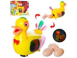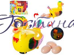 Качка розміром 19-17-13см, їздить, несе яйця, музика, світло, яйця 3шт, на батарейці. Коробка 23-18,5-13см.