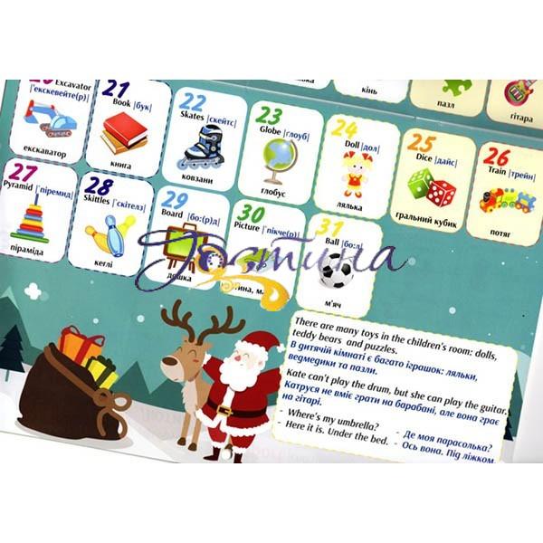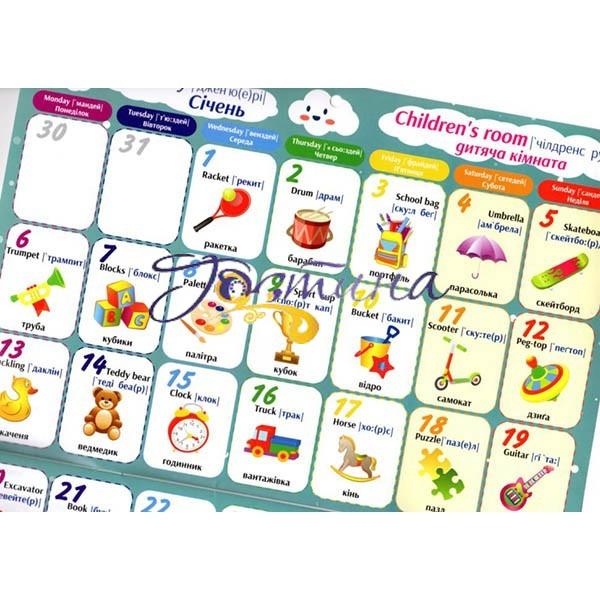 Дитячий англо-український календар-словник – гарний помічник для вивчення англійської мови дітьми. Кожен місяць – це певна тема, а кожен день – це нове слово, об'єднання єднанетемою місяця. Поряд з написанням слів англійською мовою подана транслітерація, яка дає уявлення про звучання слова для тих, хто не володіє англійською, але буде допомагати малюку вчити слова, а також декілька фраз з використанням вивчених слів.