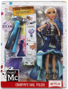 Лялька "Камрін" з набором для експериментів представлена вразити юну мрійницю красою, неповторною конструкцією наряду, його яскравою кольоровою гамою і широкими ігровими можливостями. Лялька може приймати різні ігрові пози, адже у неї рухаються ручки і ніжки, згинаючись в суглобах. Білосніжне нейлонове волосся лялькової модниці зібране в хвіст, їх можна розчісувати оригінальним гребінцем у вигляді колби. У іграшкової Кармін гарне обличчя, на яке накладено яскравий грим. Вечірня сукня складного крою підперезаний подвійним шкіряним ременем з яскравими металевими елементами. Доповнюють карнавальний костюм летючої миші фігурні крила, чорні рукавички, декоровані босоніжки на високих підборах і сережки. У комплект набору входять аксесуари для дівчинки, які дозволять їй створити блискучий лак для нігтів.