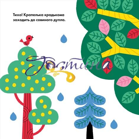 Куди подорожує маленька крапелька? Від верхівки дерева до калюжі! Стежте за нею, гортаючи книжечку! А на кожній сторінці вас чекає сюрприз завдяки прорізам!