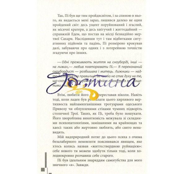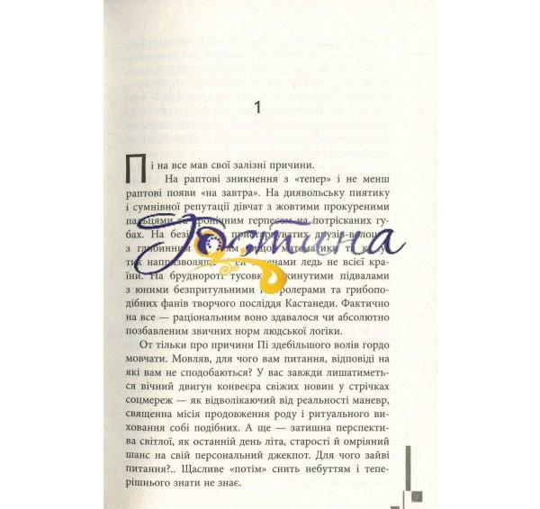 Дебютний роман Сергія Мартинюка, лідера відомого українського гурту «Фіолет», — незвична, заворожуюча книга. Оповідач історії, який не вимовить за весь роман жодного слова, вирушає зі своїм єдиним другом, котрий має дивне прізвисько невідомого походження — Пі, в мандри Україною. На цьому шляху героїв чекатимуть зустрічі з придорожніми повіями, підступними волоцюгами, ображеними на світ художниками, щойно посталими та згаслими зірками рок-н-роллу, матеріалізованими примарами минулого та містичними зблисками майбутнього. Загадкова мета вестиме героїв химерними лабіринтами їхніх власних сподівань, страхів та ілюзій, а справжній сенс цієї мандрівки вони осягнуть лише наприкінці дороги, що сама — наче заново прожите життя.