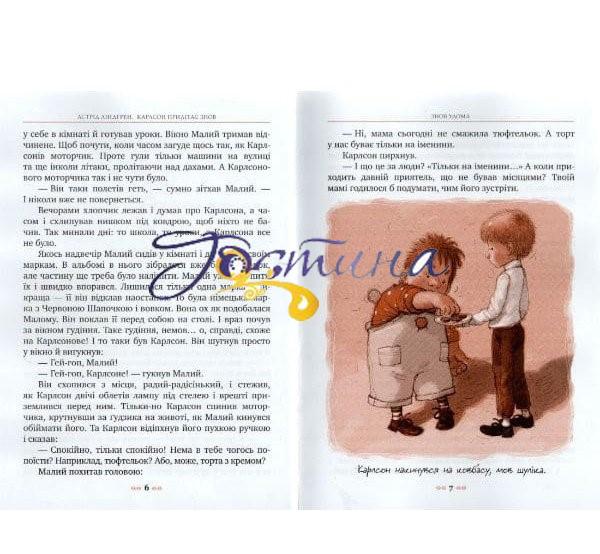 «— Тут, нагорі, все якесь не таке, — сказав Малий, коли Карлсон злетів з ним на ґанок перед хаткою». Авжеж, пригоди тривають, не менш цікаві та захопливі, ніж у попередній книжці. Герої не надто постаршали, хоча друга книжка написана, проте, аж через сім років після першої — у 1962 р. Не обійдеться в ній і без привидів, і без вибриків невгамовної фрекен Бок… Але про це та інше ти дізнаєшся сам, узявши до рук улюблену книжку, до якої доклали творчих зусиль і таланту перекладач зі шведської Ольга Сенюк і талановитий художник Арсен Джанік’ян.