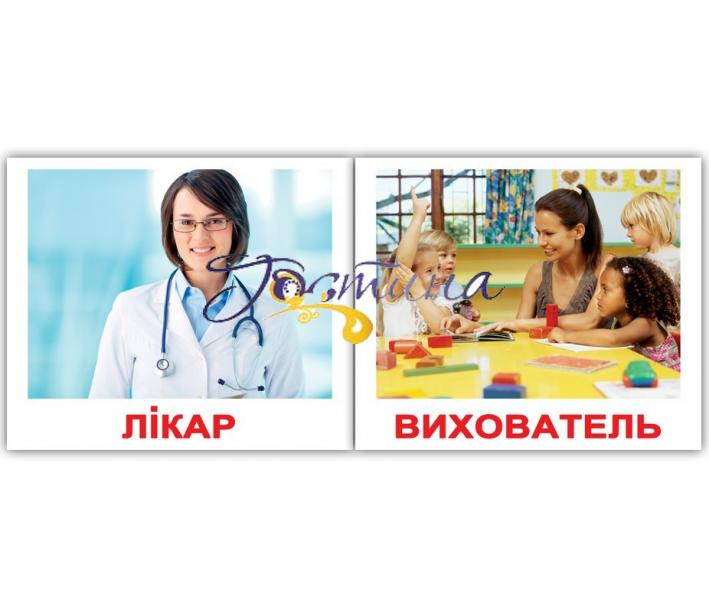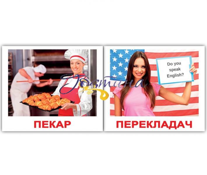 В набір увійшли 80 професій на 40 картках! 1. гід 2. няня 3. кухар 4. лікар 5. актор 6. клоун 7. пілот 8. суддя 9. юрист 10. моряк 11. пекар 12. касир 13. співак 14. модель 15. тренер 16. шахтар 17. бармен 18. фермер 19. кур'єр 20. хірург 21. ювелір 22. вчений 23. кравець 24. капітан 25. учитель 26. інженер 27. механік 28. політик 29. таксист 30. бджоляр 31. аптекар 32. перукар 33. робітник 34. редактор 35. художник 36. офіціант 37. диригент 38. менеджер 39. пожежник 40. директор 41. дизайнер 42. музикант 43. оператор 44. візажист 45. електрик 46. психолог 47. фотограф 48. священик 49. професор 50. комірник 51. покоївка 52. охоронець 53. медсестра 54. продавець 55. сантехнік 56. студентка 57. космонавт 58. провідник 59. бухгалтер 60. журналіст 61. ветеринар 62. футболіст 63. стюардеса 64. військовий 65. письменник 66. садівник 67. стоматолог 68. архітектор 69. міліціонер 70. інструктор 71. перекладач 72. масажистка 73. вихователь 74. програміст 75. рятувальник 76. будівельник 77. далекобійник 78. прибиральниця 79. адміністратор 80. домогосподарка