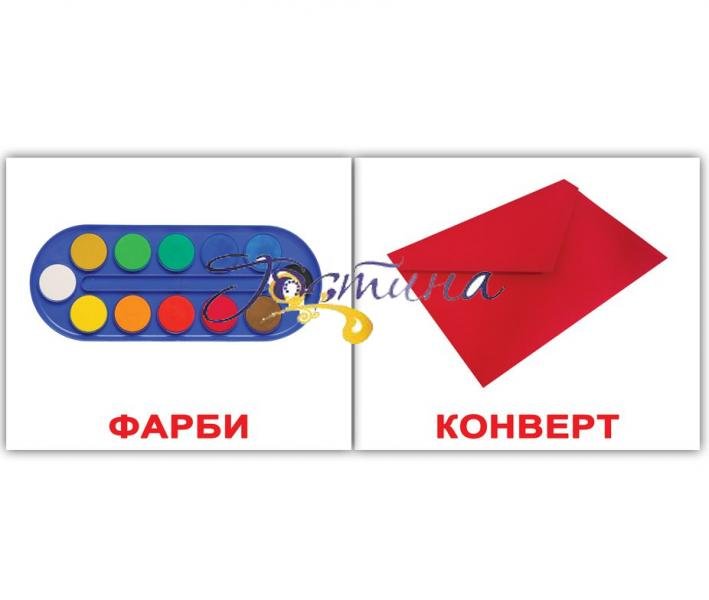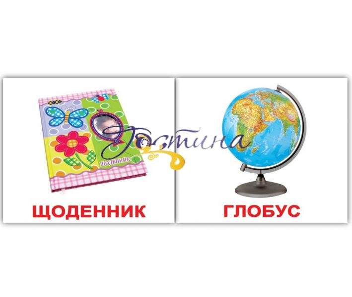 Комплект вміщує 20 двосторонніх карток: 1. Клей 2. Клас 3. Ручка 4. Парта 5. Папка 6. Фарби 7. Папір 8. Гумка 9. Скотч 10. Зошит 11. Карта 12. Книга 13. Дошка 14. Учень 15. Форма 16. Пенал 17. Крейда 18. Ножиці 19. Оцінка 20. Глобус 21. Указка 22. Лінійка 23. Пензлик 24. Олівець 25. Циркуль 26. Конверт 27. Блокнот 28. Дзвоник 29. Степлер 30. Вчитель 31. Скріпка 32. Розклад 33. Щоденник 34. Ганчірка 35. Портфель 36. Стругачка 37. Трикутник 38. Підручник 39. Калькулятор 40. Діркопробивач