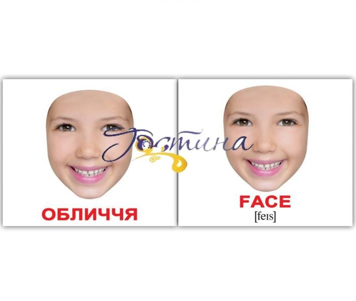 Комплект вміщує 40 карток: 1. око – еуе 2. вухо - ear 3. нога - leg 4. ніс - nose 5. рука - arm 6. шия - neck 7. губи - lips 8. пуп - navel 9. рот - mouth 10. тіло - body 11. зуби - teeth 12. кисть - hand 13. п’ята - heel 14. спина - back 15. стопа - foot 16. щока - cheek 17. кров - blood 18. мозок - brain 19. голова - head 20. груди - chest 21. коліно - knee 22. долоня - palm 23. ніготь - nail 24. язик - tongue 25. серце - heart 26. обличчя - face 27. лікоть - elbow 28. м’язи - muscle 29. хребет - spine 30. легені - lungs 31. чоло - forehead 32. палець - finger 33. печінка - liver 34. брова - eyebrow 35. вії - eyelashes 36. плече - shoulder 37. шлунок - stomach 38. зап'ясток - wrist 39. підборіддя - chin 40. скелет – skeleton