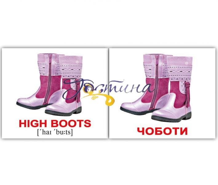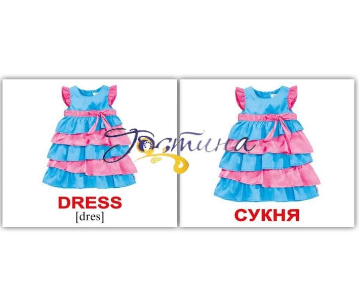 Комплект вміщує 40 карток: 1. Body/Боді 2. Top/Кофта 3. Vest/Жилет 4. Dress/Сукня 5. Tie/Краватка 6. Coat/Пальто 7. Shoes/Туфлі 8. Blouse/Блузка 9. Skirt/Спідниця 10. Jacket/Куртка 11. Shirt/Сорочка 12. Sweater/Светр 13. Tights/Колготи 14. Bathrobe/Халат 15. Gloves/Рукавички 16. T-shirt/Футболка 17. Trainers/Кросівки 18. Knee socks/Гольфи 19. Capri pants/Бриджі 20. Flip-flops/Шльопанці 21. Belt/Пояс 22. Cap/Кепка 23. Hat/Шапка 24. Scarf/Шарф 25. Suit/Костюм 26. Shorts/Шорти 27. Panties/Труси 28. Jeans/Джинси 29. Raincoat/Плащ 30. Boots/Черевики 31. Trousers/Штани 32. Pajamas/Піжама 33. Slippers/Тапочки 34. Socks/Шкарпетки 35. Sundress/Сарафан 36. Sandals/Босоніжки 37. High boots/Чоботи 38. Overall/Комбінезон 39. Suit jacket/Піджак 40. Swimming suit/Купальник