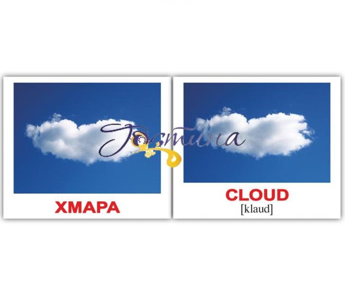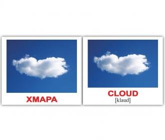 Комплект вміщує 40 карток: 1. небо - sky 2. сонце - sun 3. сніг - snow4. дощ - rain 5. вітер - wind6. вогонь - fire7. море - sea 8. океан - ocean 9. озеро - lake10. річка - river11. ліс - forest12. пустеля - desert13. камінь - stone14. струмок - brook15. вулкан - volcano16. гриб - mushroom17. трава - grass18. веселка - rainbow19. метелик - butterfly20. ураган - hurricane21. поле - field22. кущ - bush23. лист - leaf24. птах - bird25. лід - ice26. пісок - sand27. мураха - ant28. жаба - frog29. дерево - tree30. хмара - cloud31. печера - cave32. стежка - path33. острів - island34. квітка - flower35. гора - mountain36. джунглі - jungle37. айсберг - iceberg38. захід сонця – sunset39. блискавка - lightning40. водоспад - waterfall