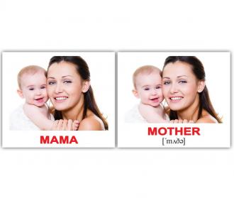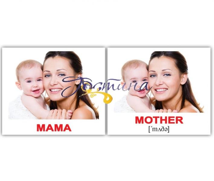 Комплект вміщує 40 карток: 1. мама - mother2. тато - father3. син - son4. донька - daughter5. дитина - child6. діти - children7. сім’я - family8. брат - brother9. сестра - sister10. батьки - parents11. малюк - baby12. чоловік - husband13. дружина - wife14. кохана - girlfriend15. підліток - teenager16. бабуся - grandmother17. дідусь - grandfather18. онука - granddaughter19. онук - grandson20. тітка - aunt21. дядько - uncle22. дівчинка - girl23. пара - couple24. мужчина - man25. жінка - woman26. юнак - guy27. родичі - relatives28. близнюки - twins29. друзі - friends30. наречена - bride31. наречений - bridegroom32. однокласник – classmate33. хлопчик - boy34. дівчина – young woman35. сусіди - neighbors36. племінниця - niece37. племінник - nephew38. коханий - boyfriend39. гість - guest40. двоюрідні сестра і брат - cousins