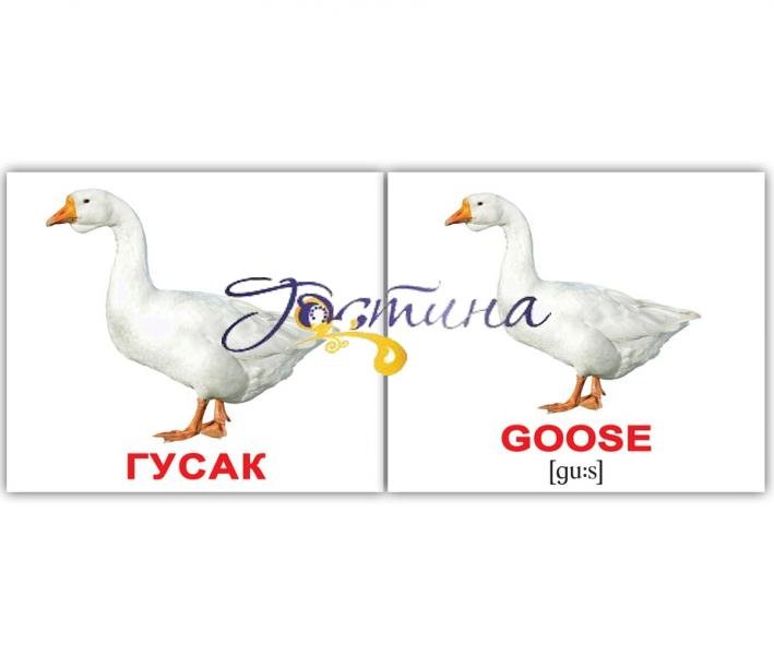Комплект вміщує 40 карток: 1. Cat/Кішка2. Kitten/Кошеня3. Dog/Собака4. Puppy/Цуценя5. Degu/Дегу6. Cow/Корова7. Calf/Теля8. Horse/Кінь9. Foal/Лоша10. Hen/Курка11. Rooster/Півень12. Chick/Курча13. Duck/Качка14. Duckling/Каченя15. Goose/Гусак16. Gosling/Гусеня17. Hamster/Хом’як18. Skinny pig/Скіні19. Chinchilla/Шиншила20. Guinea pig/Морська свинка21. Pony/Поні22. Sheep/Вівця23. Lamb/Ягня24. Donkey/Осел25. Foal/Осля26. Pig/Свиня27. Piglet/Порося28. Rabbit/Кролик29. Bunny/Кроленя30. Goat/Коза31. Goatling/Козеня32. Ferret/Тхір33. Turkey/Індик34. Iguana/Ігуана35. Alpaca/Альпака36. Parrot/Папуга37. Gerbil/Піщанка38. Tortoise/Черепаха39. Giant snail/Ахатина40. Aquarium fish/Акваріумна рибка