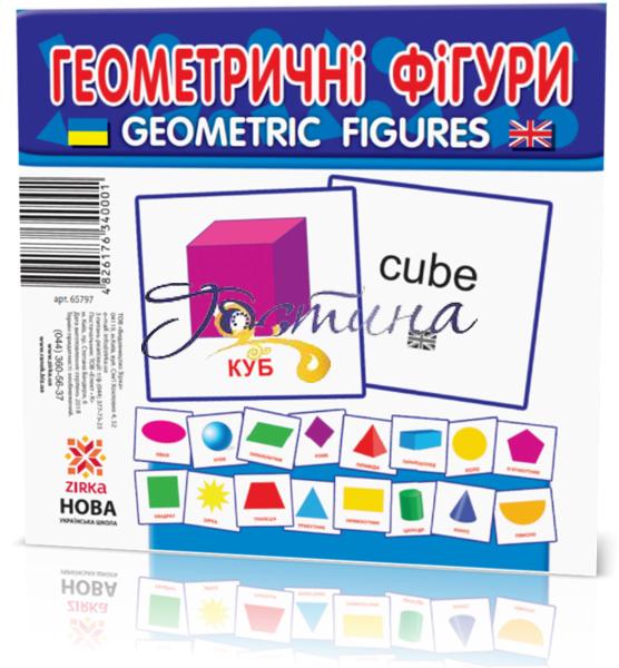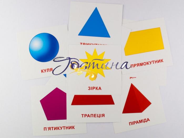 Картонні картки, на кожній з карток зображено різні геометричні фігури та їх назви.