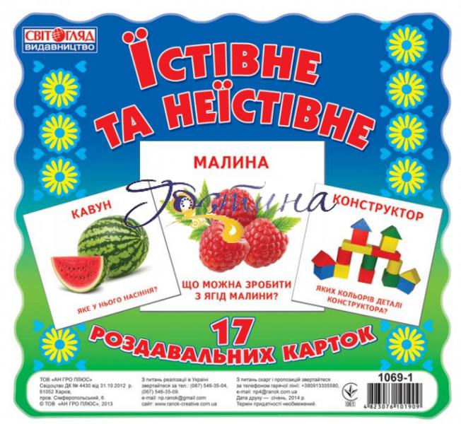 17 роздавальних карток на задану тему. У наборі 17 карток за їстівне та неїстівне. Використання карток дозволить учням швидко вичити назви їстівних та неїстівних овочей на фруктів.
