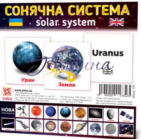 У наборі: телескоп, Сонце, Нептун, Уран, Венера, галактика, астероїд, супутник, комета, космічна станція, Місяць (супутник Землі), Юпітер, Марс, Сатурн, Земля, Меркурій, сонячна система.