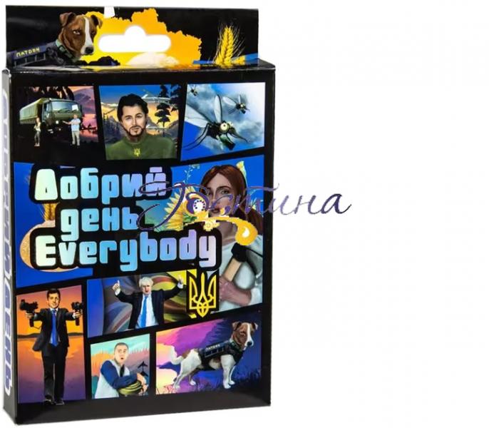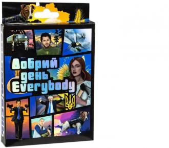 Добрий день, Everybody – це карткова гра, в якій всі зображення пов'язані з подіями російсько-української війни 2022. Наприклад, ви знайдете тут: і персонажів мемів, і героїв, і національні атрибути України. Грати просто, але доведеться задіяти свою пам'ять. Розставте картки перед собою, запам'ятайте їх та перевертайте. Тепер, викладаючи кожний раз свою картку, доведеться згадувати який і де персонаж і скільки балів він коштує.