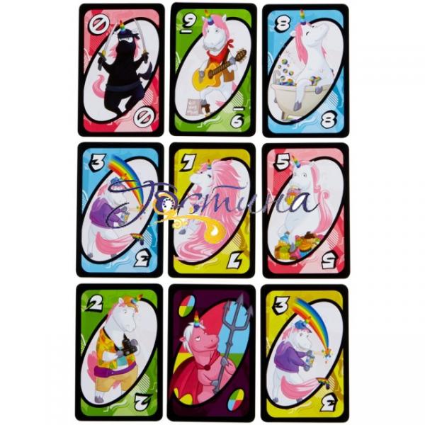Зустрічай нову гру UNO 'Єдиноріг' - справжню знахідку для шанувальників дивних міфічних створінь. Крім класичних карт, в набір входять 4 дикі карти 'Правило нарвала'. Згідно з ним, якщо ти зіграєш цією картою, то кожен гравець повинен витягнути з колоди по карті, що не дивлячись прикріпити її до чола і вгадати колір карти під час свого ходу. Якщо вгадав - продовжуєш гру, немає - пропускаєш хід і тримаєш карту на чолі до тих пір, поки не даси правильну відповідь. У наборі 112 карт і інструкція.