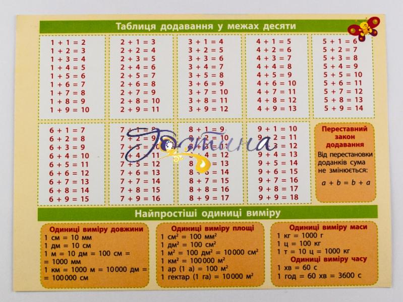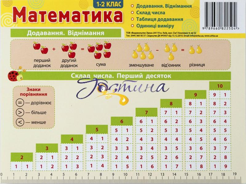Картонка-підказка містить: склад числа, приклади, визначення та схеми з курсу математики початкової школи. Вона стане незамінним помічником для учнів 1-2 класів під час навчання на уроках та вдома.