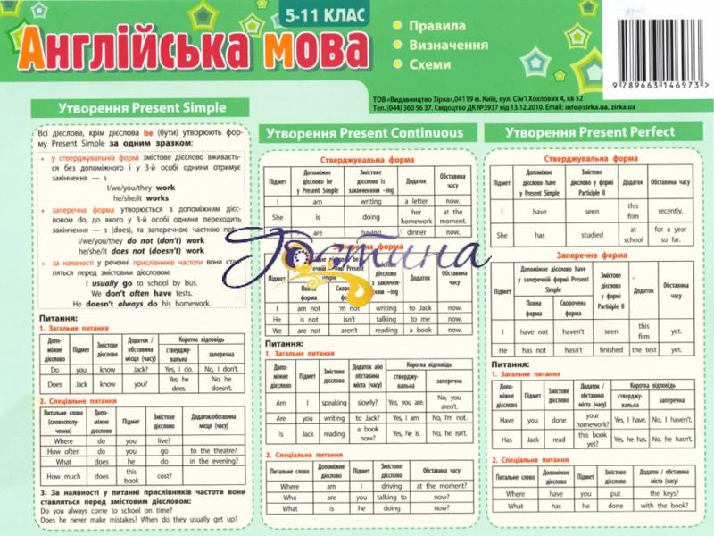 Картонка-підказка містить: основні правила, визначення та схеми з англійської мови.
