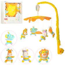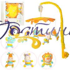 Карусель з плюшевими іграшками виконана в приємній колірній гамі. За допомогою заводного механізму радувати дитину буде приємна мелодія, як в музичних скриньках.