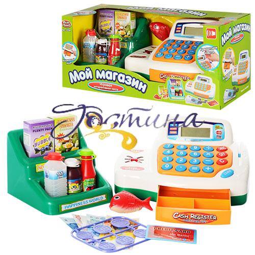 Касовий апарат в коробці.Зукові та світлові ефекти. На батарейках (в набір не входять). В набір входить: -калькулятор. - продуктова вітрина. Розмір коробки 40*17*17см.