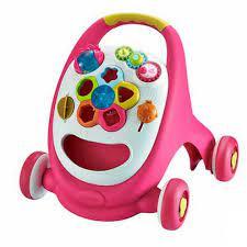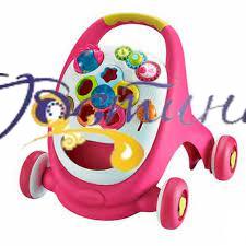 Особливості: -ходунки мають форму без гострих кутів, завдяки рухливим колесам з блокуванням, вони стійко стоять або переміщуються; -каталка має зручну ручку, за яку дитина може триматись, штовхаючи її перед собою; -на ігровій панелі розміщені різноманітні іграшки для розвиваючих ігор та вправ: 1. квіточка і важіль, які можна пересувати і повертати; 2. обертаються шестерні для розвитку дрібної моторики; 3. сортер у вигляді квітки з різнокольоровими пелюстками 5 фігурками, завдяки якому дитина навчиться розрізняти предмети за їх формою, розміром і кольором. - із зворотного боку ємність-кошик для іграшок; -колеса з можливістю фіксації. Висота від підлоги до ручки: 48 див.