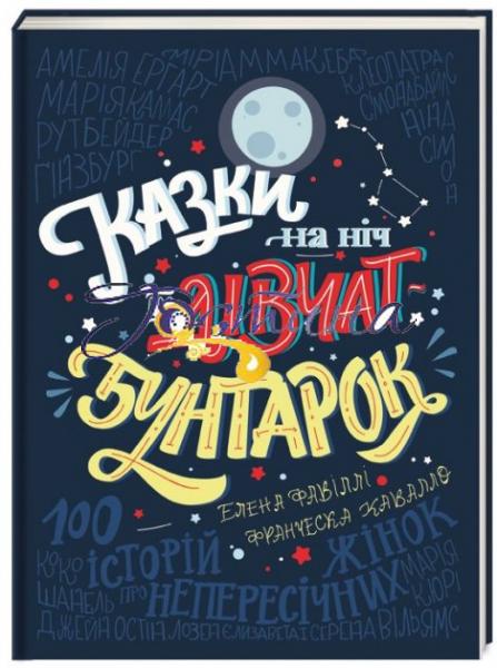 «Казки на ніч для дівчат-бунтарок» – це сто розповідей про життя ста надзвичайних жінок, проілюстровані сотнею яскравих портретів. Деякі з цих жінок жили давно, деякі – наші сучасниці. Деякі походять із багатих родин, деякі в дитинстві злидарювали. Деякі відомі на весь світ, а про деяких намагалися зумисно забути. Але кожна з них по-своєму змінила світ. Їхні таланти вражають, їхні вчинки надихають, їхні досягнення та відкриття – важлива частина історії людства. Ця збірка оповідок покликана надихати дівчат. У книжці містяться історії про 100 видатних жінок: від Єлизавети І до Серени Вільямс. Ілюстрації для видання створили 60 художниць з різних куточків планети. Цей проект зібрав найбільше фінансування серед книжкових проектів за всю історію краудфандингу.
