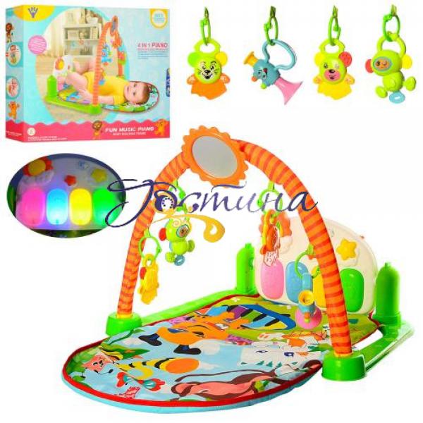 Килимок для немовляти HY68109 86-51см, піаніно, подвескі5шт, муз, зв, світло, на бат, в коробці. Розмір - 53-43-9см, Тип харчування - на батарейці, Матеріал - пластмаса + тканина, Тип упаковки - коробка.