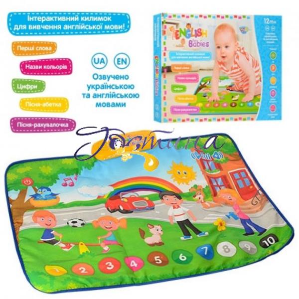 Інтерактивний навчальний килимок стане корисним для найменших діток, які тільки починають пізнавати світ. Цей килимок озвучений 2 мовами (українська та англійська), що допоможе малюкові з ранніх років звикнути не тільки до рідної мови, але й навчиться розпізнавати інші. На самому килимку зображена яскрава картинка та цифровий ряд у різнокольорових кружечках. Граючи на ньому ваша дитина навчиться розпізнавати кольори та вивчить цифри. Килимок виготовлений з гіпоалергенного матеріалу і має достатню товщину, щоб малюк відчував себе на ньому комфортно і тепло.