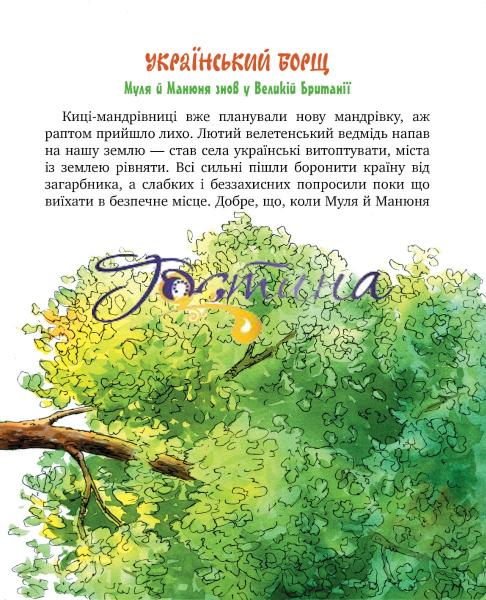 Муля та Манюня дуже люблять подорожувати. Проте цього разу киці подаються в мандри не з власної волі. Вони вимушені рятуватися від страшного ведмедища, який напав на Україну. Звісно, друзі з різних країн готові прийняти киць-мандрівниць у себе. Тож читай у цій книжці, як Муля та Манюня навчатимуть англійців варити борщ, збиратимуть гроші для песика Патрона в Польщі та дадуть великий благодійний концерт у Литві.