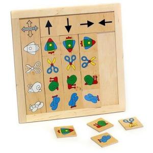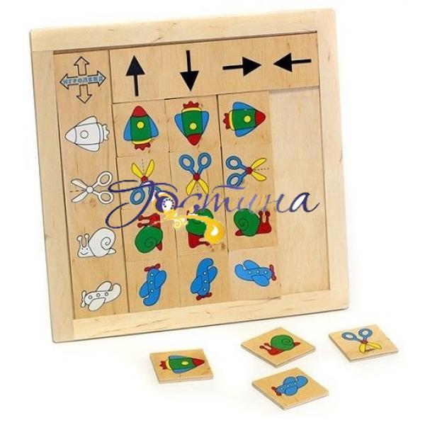 Класифікація 'Вкажи напрямок' - дерев'яний планшет, розміром 27х27 см., та 16 карток 5х5 см із зображеннями ракети, ножиць, равлика та літачка. На лівій стороні планшета по вертикалі знаходяться контури цих зображень, а по горизонталі зазначено напрям: вгору, вниз, вправо, вліво. Ігрове завдання - розмістити картки щодо предмета та його напрямку. Гра спрямована на: розвиток у дитини зорового сприйняття, уваги, пам'яті; формування вміння аналізувати, виділяти основні ознаки предмета, об'єднувати предмети на основі декількох ознак; активізацію процесу логічного мислення.
